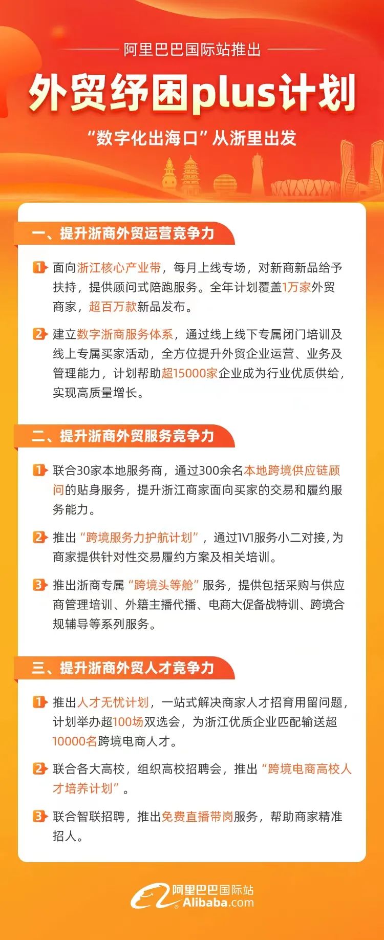 近年来,包括浙江新能源汽车万亿产业链、浙江智能家居五千亿产业链、浙江服装产业集群、义乌小商品和饰品产业集群、永康五金产业集群等在内的浙江省五大产业链加速崛起。此次“外贸纾困plus计划”将面向浙江核心产业带,每月上线专场,对新商新品给予扶持,提供顾问式陪跑服务。全年计划覆盖1万家外贸商家,超百万款新品发布。还将建立数字浙商服务体系,通过线上线下专属闭门培训及线上专属买家活动,全方位提升外贸企业运营、业务及管理能力,计划帮助超15000家企业成为行业优质供给,实现高质量增长。