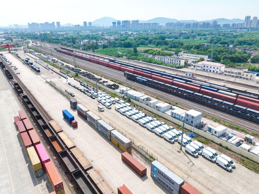 在位于惠山区的无锡国家级物流枢纽,一批批集装箱完成装车作业,由货运列车转运至港口码头。该枢纽围绕服务“一带一路”,全力构建“枢纽+通道+网络+服务+产业”发展新格局,成功培育了中欧接续班列、海铁联运班列、笼车内外贸班列、广州国际港班列和“中吉乌”铁公联运班列“五大产品矩阵”。