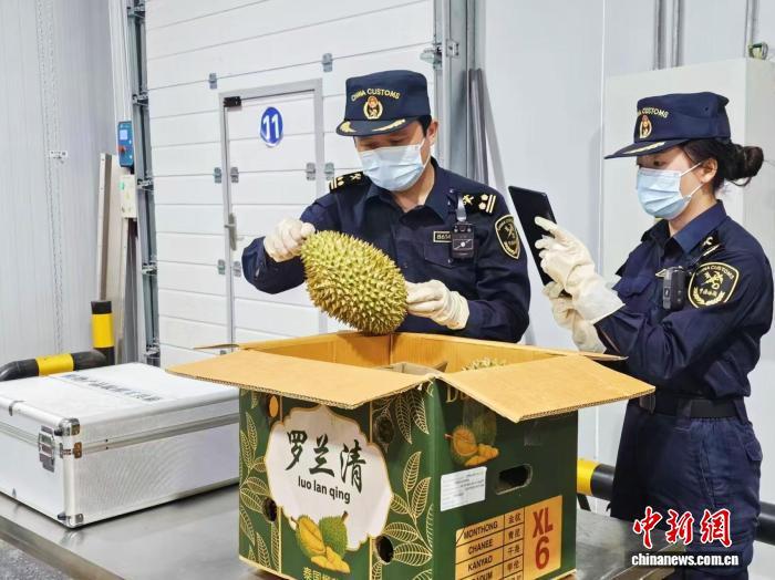 海关关员在磨憨铁路口岸对进口榴莲进行查验。周炜 摄